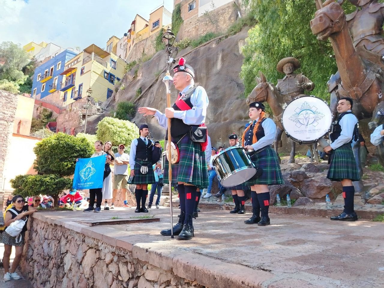 Guanajuato, Gto.- Provenientes de las colinas de Escocia y los acantilados de Irlanda, la Banda de Gaitas del Batallón de San Patricio, llevó a cabo un desfile-concierto este domingo 12 de octubre, en el centro histórico de Guanajuato capital, esto en el marco del 53 Festival Internacional Cervantino 2025.