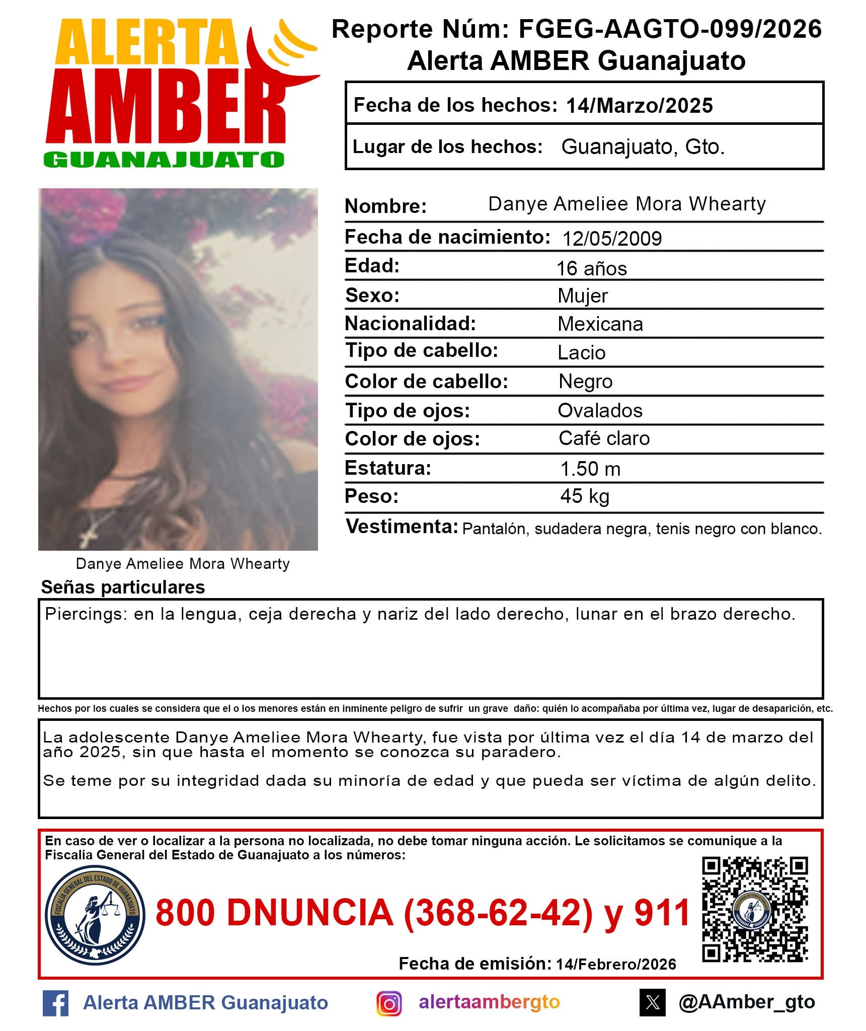 Danye Ameliee Mora Whearty, adolescente de 16 años desapareció el 14 de marzo del 2025 en Guanajuato capital sin que hasta el momento se tenga información de su paradero.