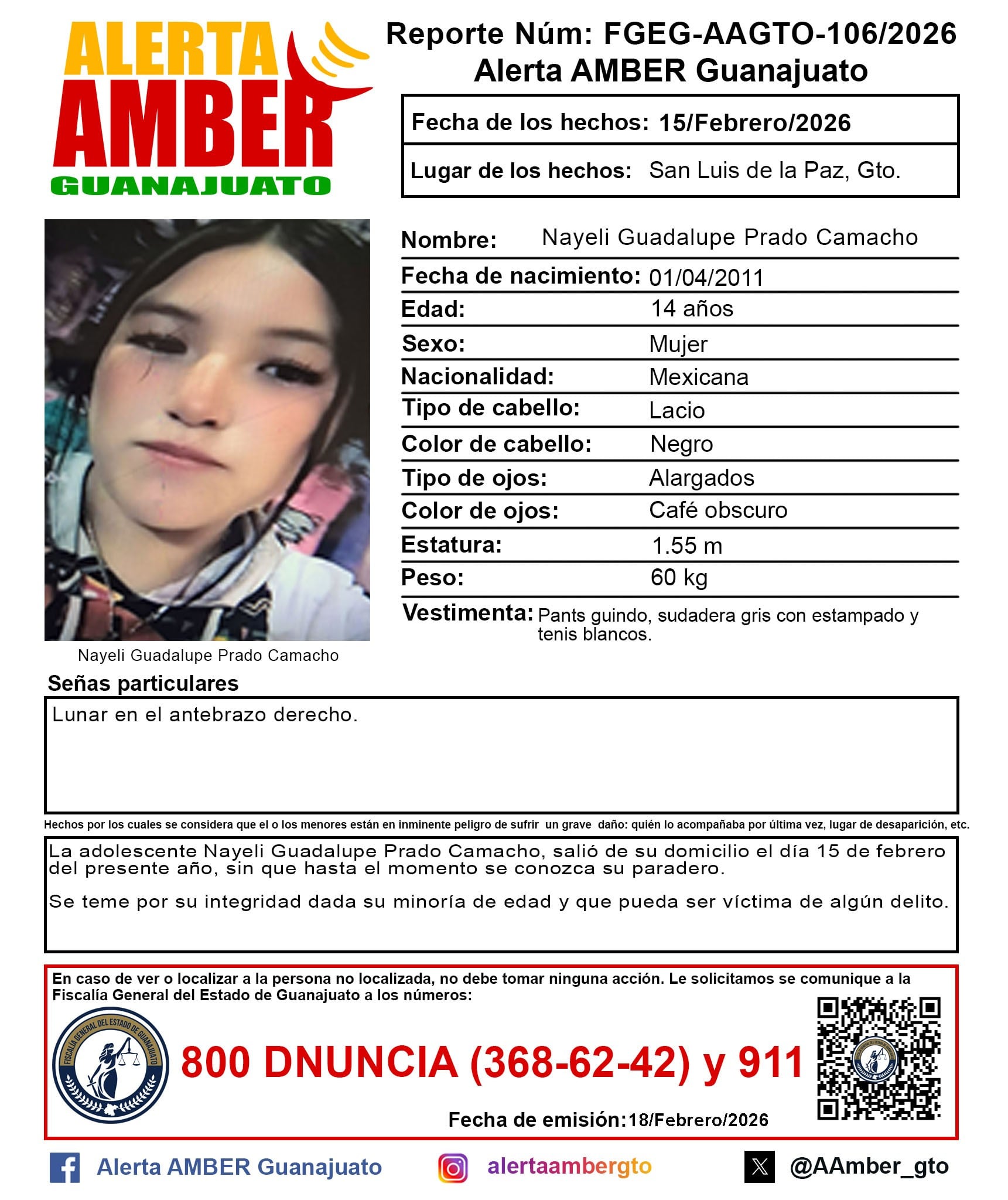 Guanajuato, México.- En las últimas horas el programa Alerta Amber activó la ficha de búsqueda de Nayeli Guadalupe Prado Camacho, adolescente reportada como desaparecida en San Luis de la Paz.