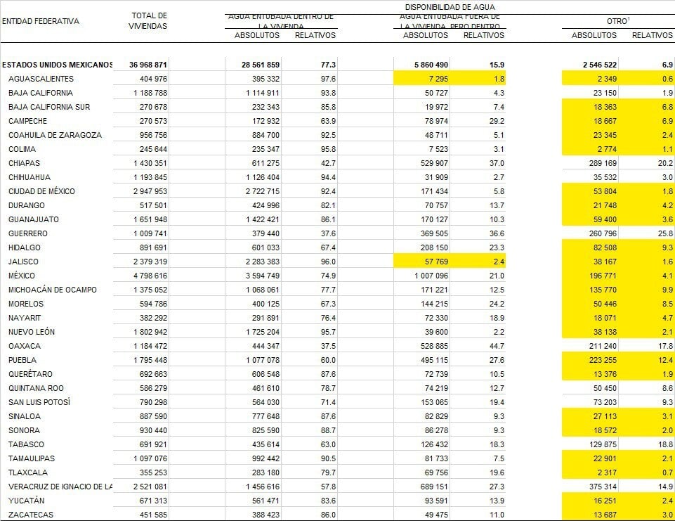 Sin embargo, de éstas, el 86.1 por ciento, que se traducen en 1 millón 422 mil 421, contaba con el servicio de agua entubada dentro de la vivienda. Las restantes 170 mil 127 viviendas, correspondientes al 10.3 por ciento del total, declararon tener agua entubada fuera de la vivienda, pero dentro del mismo terreno, según consideró el propio Instituto Nacional de Estadística y Geografía mediante la recopilación de los datos.