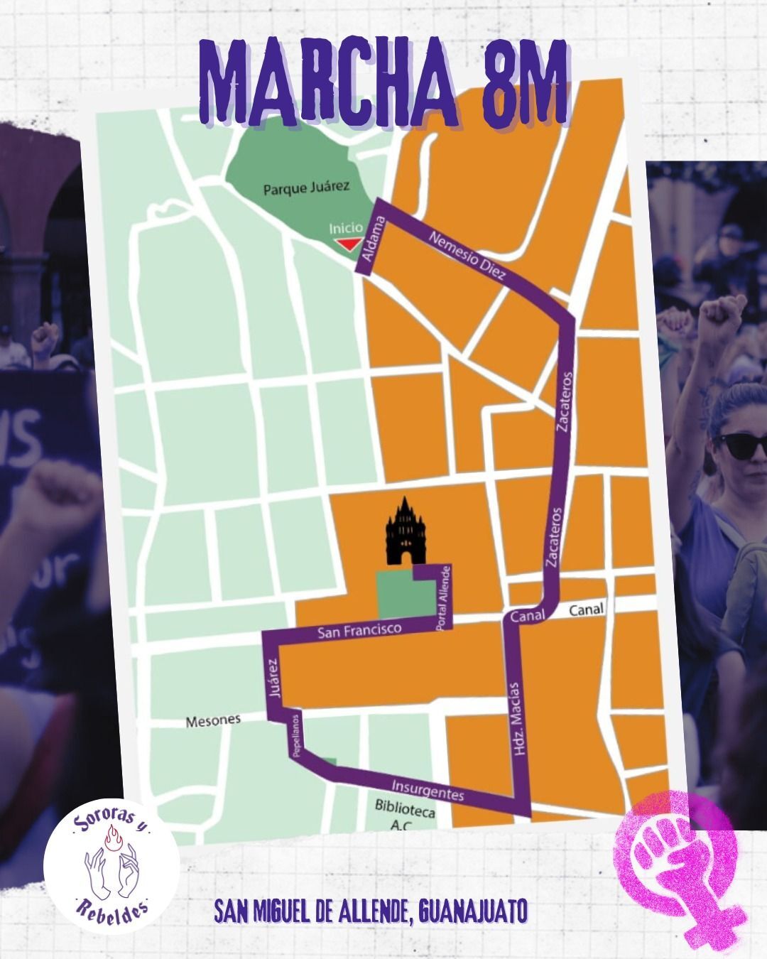 Colectiva Sororas y Rebeldes SMA da a conocer la ruta de la marcha 8M en San Miguel de Allende. Fuente: Sororas y Rebeldes SMA