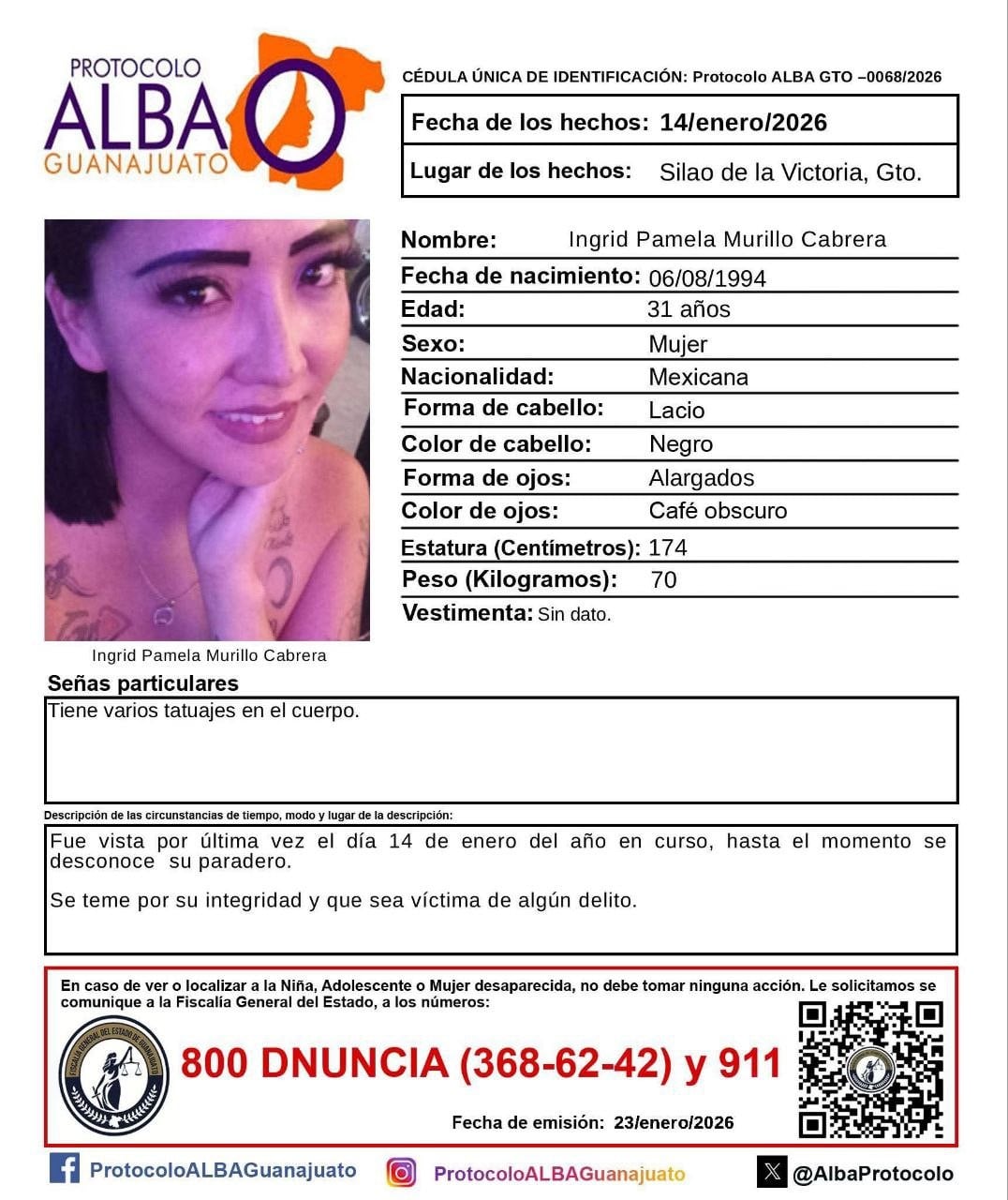A través del Protocolo Alba con número ALBA GTO – 0068/2026, se inició la búsqueda de Ingrid Pamela Murillo Cabrera de 31 años, quien es de cabello lacio y negro, ojos alargados café oscuro, mide 1.74 metros y pesa aproximadamente 70 kilos.