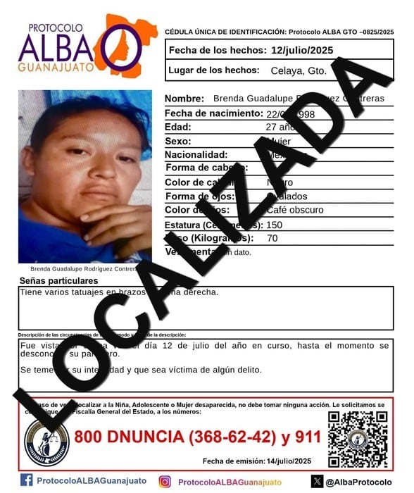 Guanajuato, Gto.– A más de cinco meses de su desaparición en el municipio Celaya, Guanajuato, se reportó la localización sin vida de Brenda Guadalupe Rodríguez Contreras. La fiscalía general del estado ratificó el hallazgo la tarde de este lunes 29 de diciembre, modificando el estatus de la joven de 27 años en el registro del Protocolo Alba.
