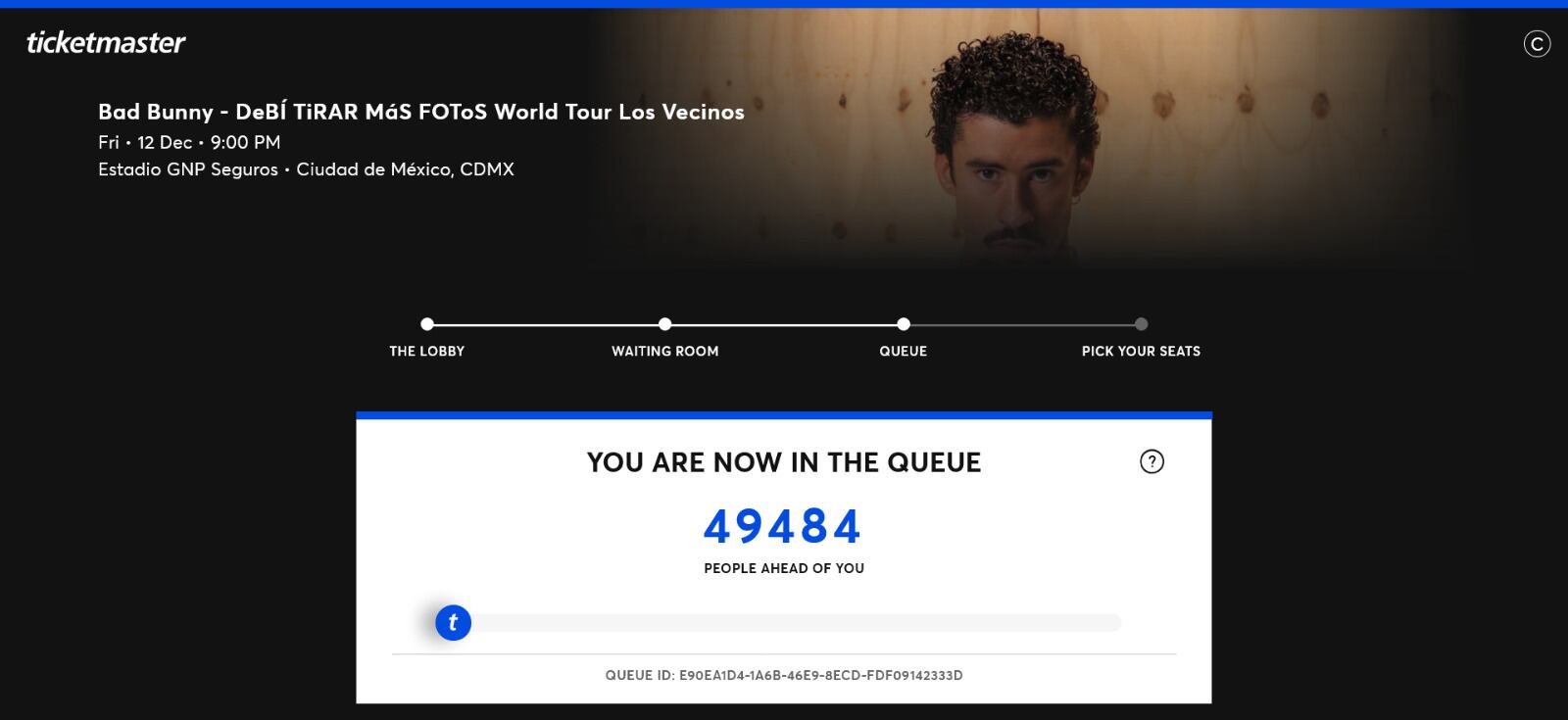 “¡Gracias por tu paciencia! Los fans están ahora avanzando en la fila. La demanda para la gira DeBÍ TiRAR MáS FOToS de Bad Bunny es muy alta, no cierres esta ventana de tu navegador para no perder tu lugar en la fila”, anunció la boletera en su sitio.