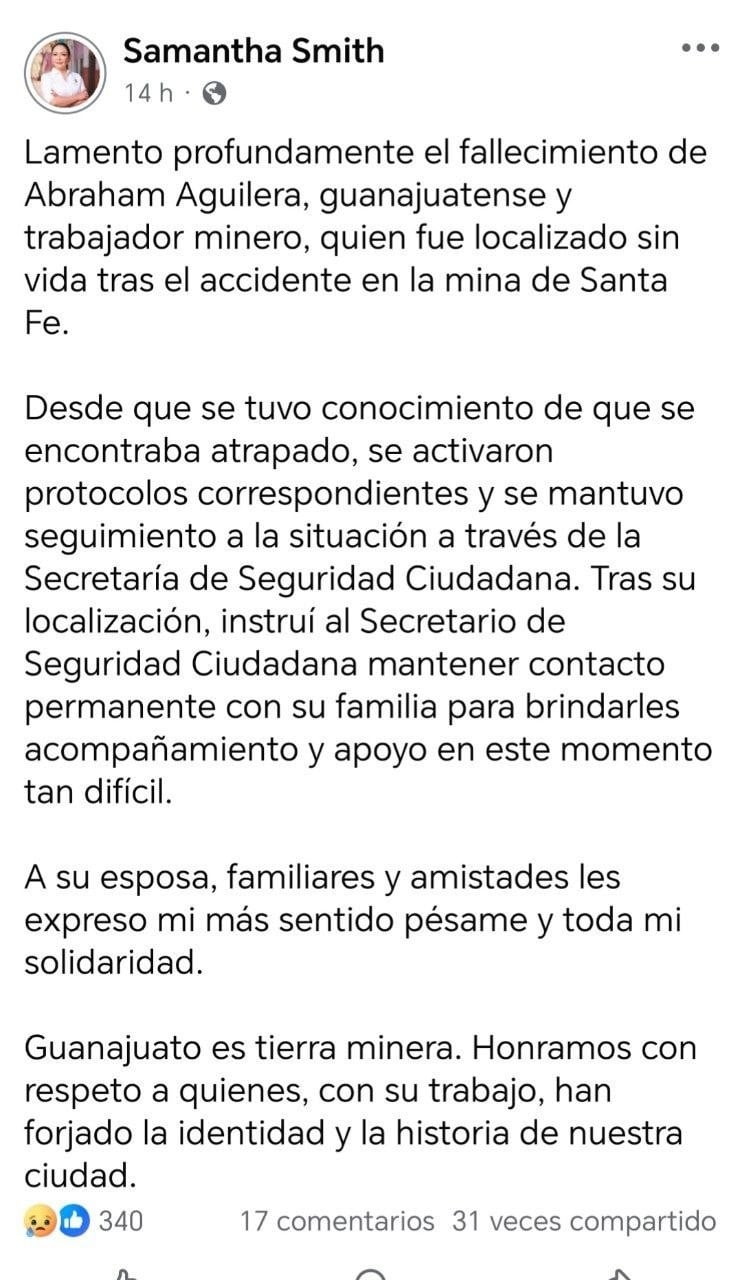 Este sábado por la noche, la presidenta municipal de Guanajuato, Samanta Smith Gutiérrez, publicó un mensaje en sus redes sociales donde lamentó el fallecimiento del minero capitalino Abraham Aguilera, cuyo cuerpo fue identificado este sábado 11 de abril por la Fiscalía del Estado de Sinaloa, luego de haber perdido la vida en un derrumbe ocurrido el pasado 25 de marzo en la mina Santa Fe, localizada en el municipio de El Rosario, en aquella entidad.