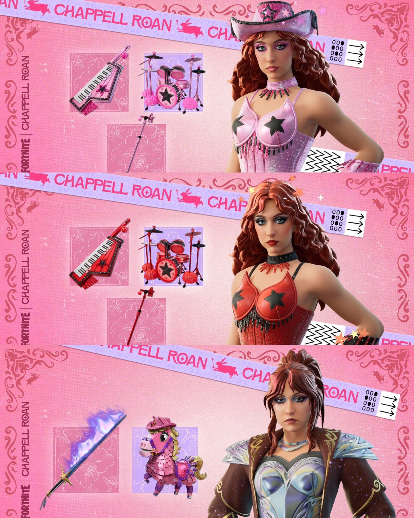 Para su colaboración con Fornite, el skin de Chappell Roan incluye un atuendo rosa que va con la canción Pink Pony Club, con su sombrero vaquero rosa, así como un traje inspirado en “Roan de Arc”, con espada y traje de batalla como el que usó en los Grammy para interpretar Good Luck, Babe! en 2025.