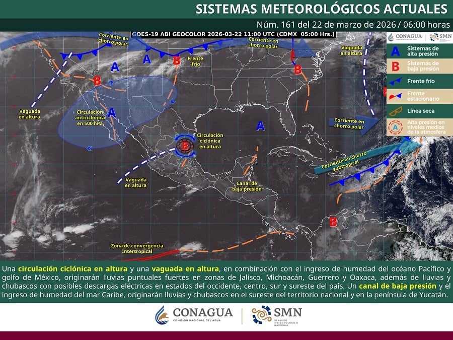Junto al ingreso de este sistema frontal, una vaguada en altura en combinación con el ingreso de humedad del océano Pacífico y golfo de México ocasionarán chubascos y lluvias con descargas eléctricas en el occidente, centro, oriente y sur del territorio mexicano.