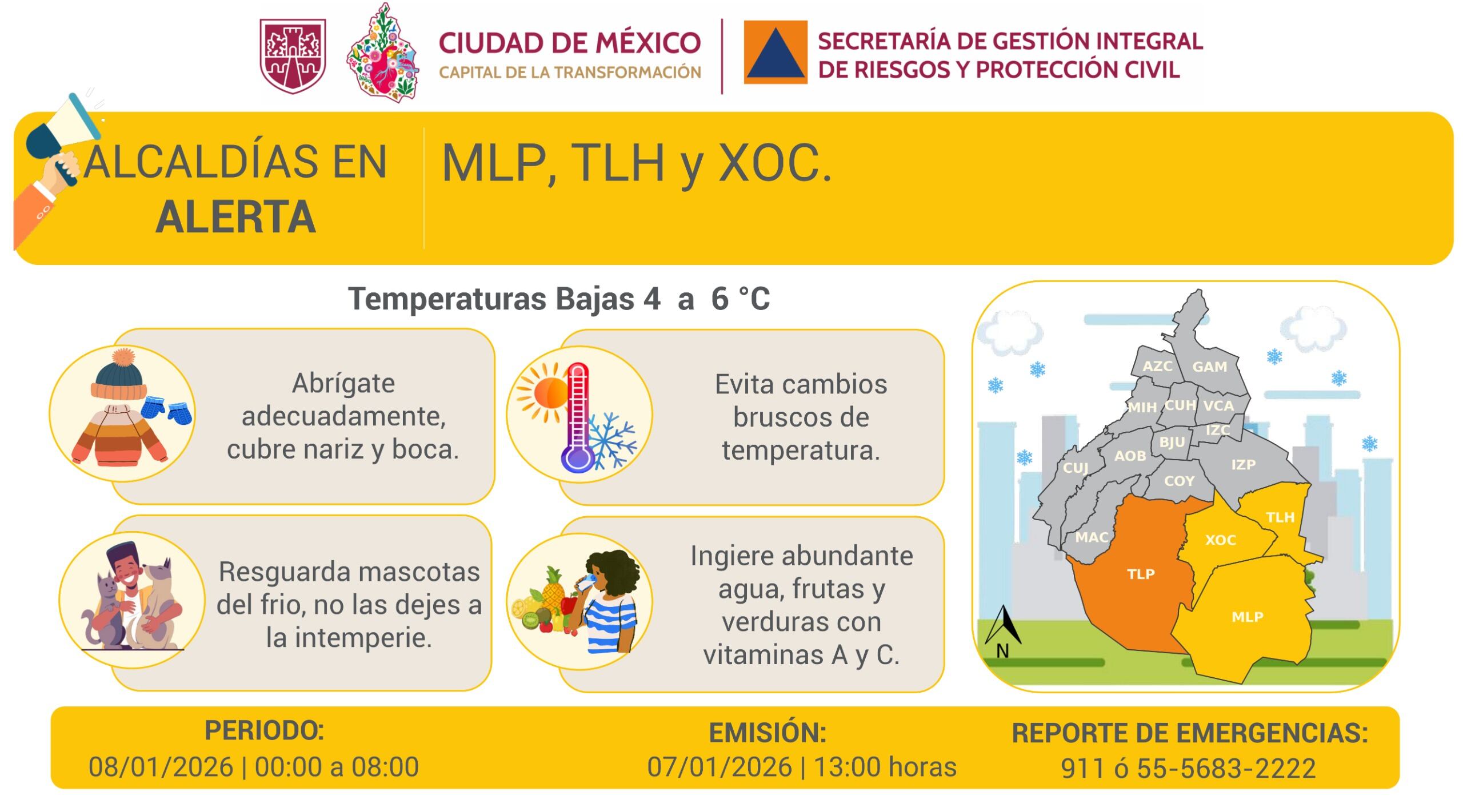 • Alerta Amarilla: vigente en Milpa Alta, Tláhuac y Xochimilco, con pronósticos de mínima entre 3 °C y 6 °C.