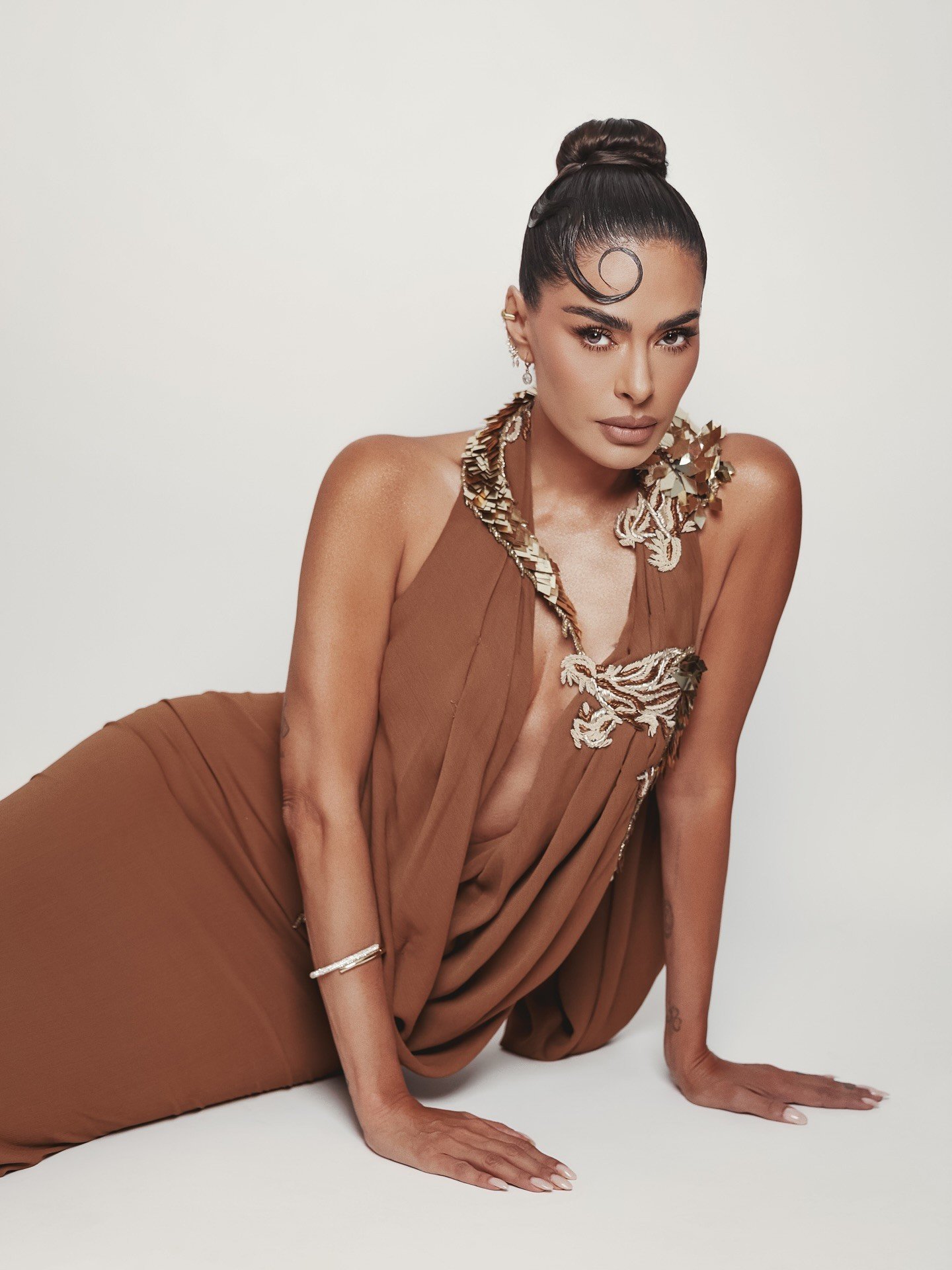 Aunque el vestido original es de una casa de moda en Nueva York conocida como Bronx and Banco, el diseño fue intervenido por los diseñadores de Montijo, Marmolejo y la firma IannDey.