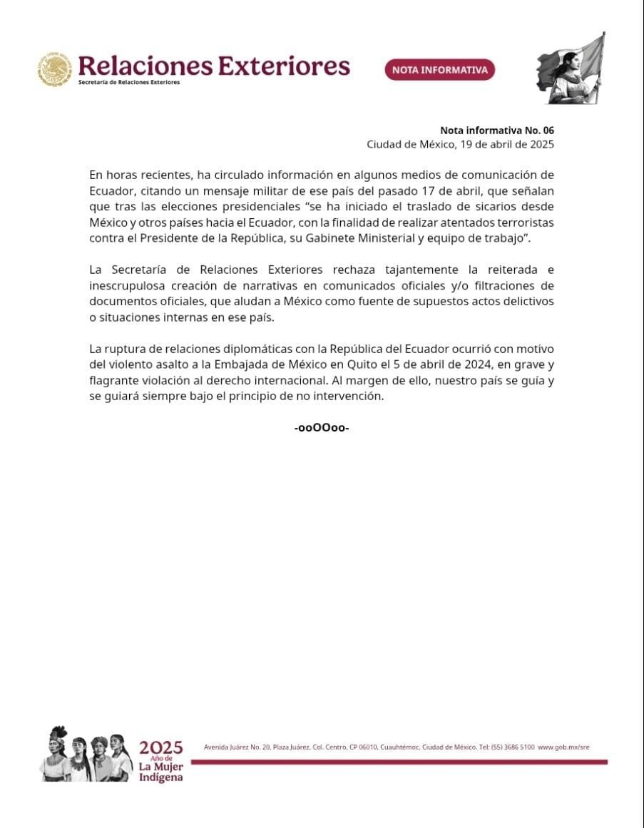Ciudad de México, México.- A través de un comunicado oficial la Secretaría de Relaciones Exteriores de México respondió al informe del Comando Conjunto de las Fuerzas Armadas (Comaco) y la Inteligencia Militar de Ecuador. Con respecto a un presunto traslado de sicarios para “atentar” y “desestabilizar” el gobierno del mandatario reelecto Daniel Noboa Azín.