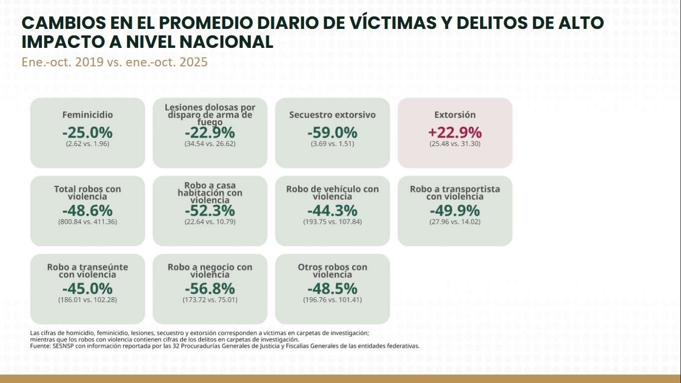 De acuerdo a lo informado por la titular de SESNSP, respecto al periodo de enero a octubre del 2024 en comparación con el presente año, fueron 26 entidades federativas las que disminuyeron su promedio diario de víctimas, donde Guanajuato ocupa la posición número 17.