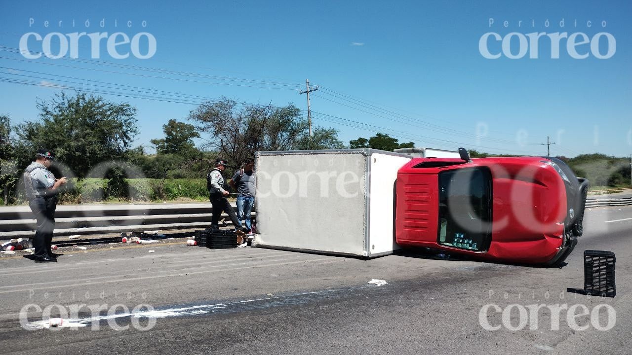 Vuelca camioneta con lácteos en carretera Irapuato-León, a la altura de Los Nicolases