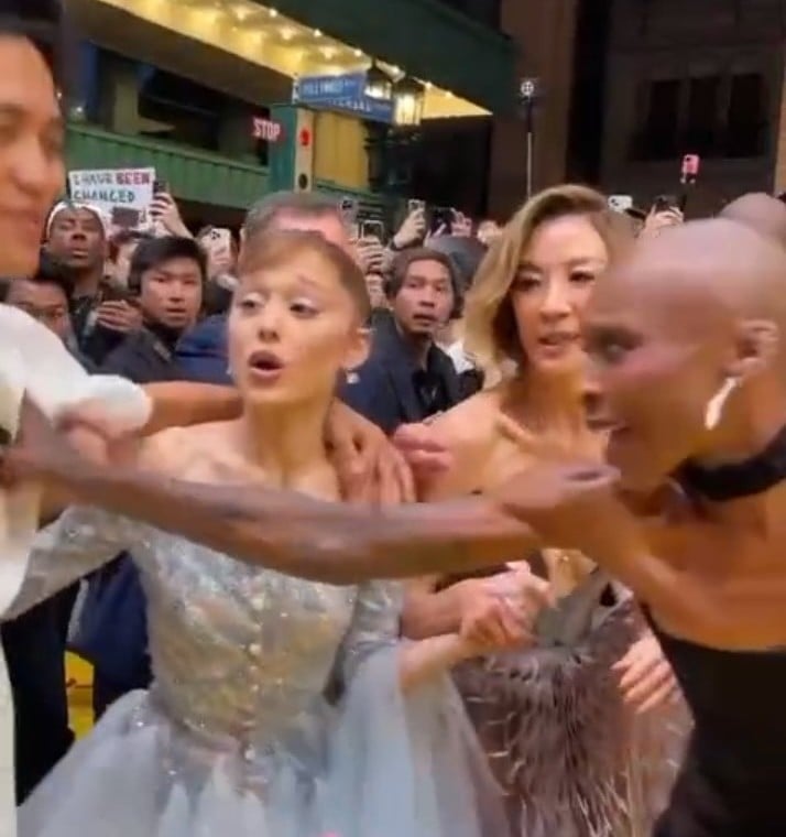 El video viral muestra al Australiano Johnson Wen empujando a los fotógrafos para abalanzarse sobre Ariana mientras el elenco desfilaba por una alfombra amarilla rodeada de fans.