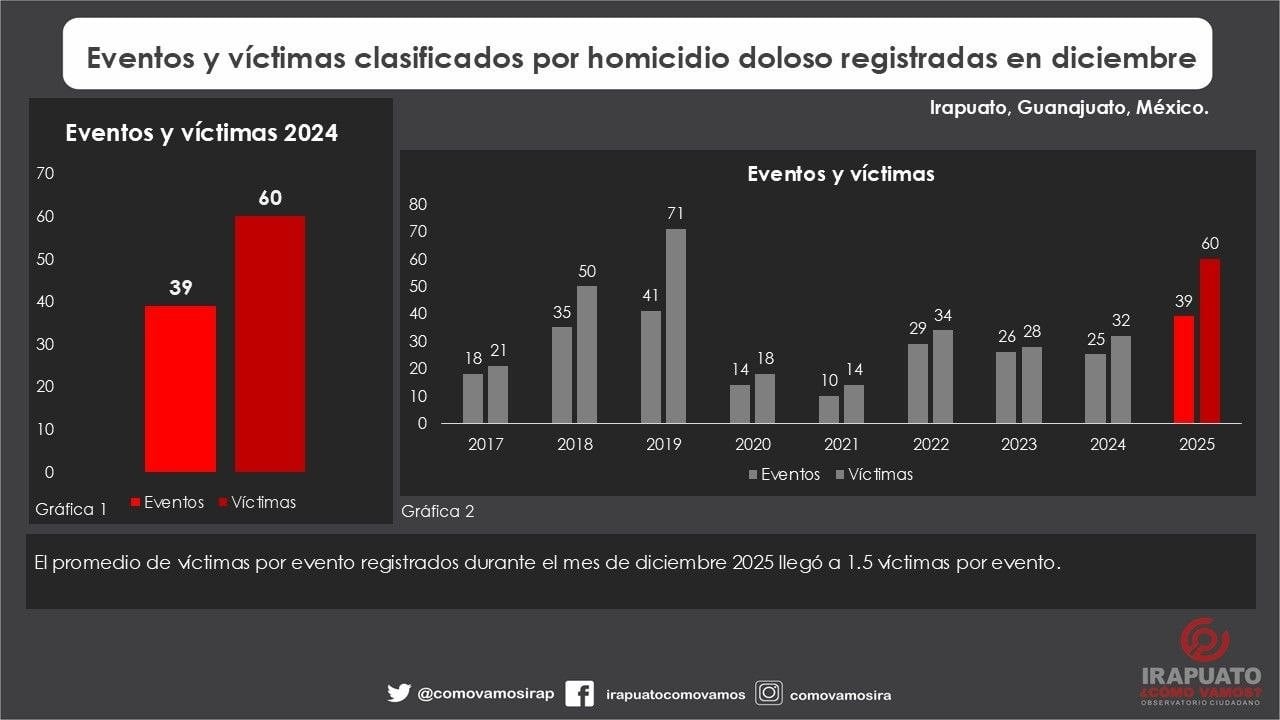“Aumentaron las víctimas por homicidio doloso en un 88%. En los últimos 9 años en el mes de diciembre, el 2025 fue el segundo diciembre más letal en Irapuato por debajo del registro del 2019”, informó Raúl Calvillo Villalobos, director del Observatorio Ciudadano Irapuato cómo vamos.
