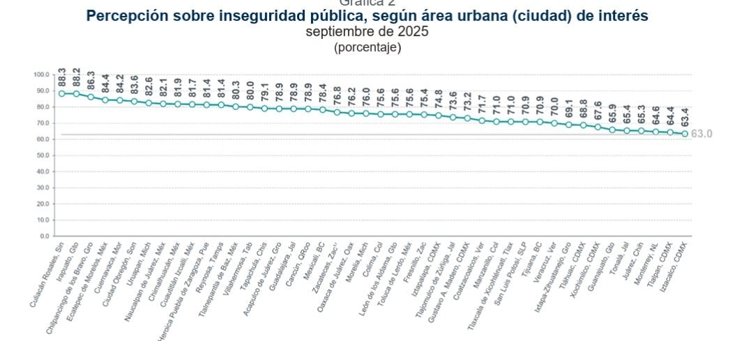 La información presentada por el Instituto Nacional de Estadística y Geografía (INEGI) reportó que de 91 áreas urbanas contempladas, el 63% de la población consideró inseguro vivir en su ciudad.
