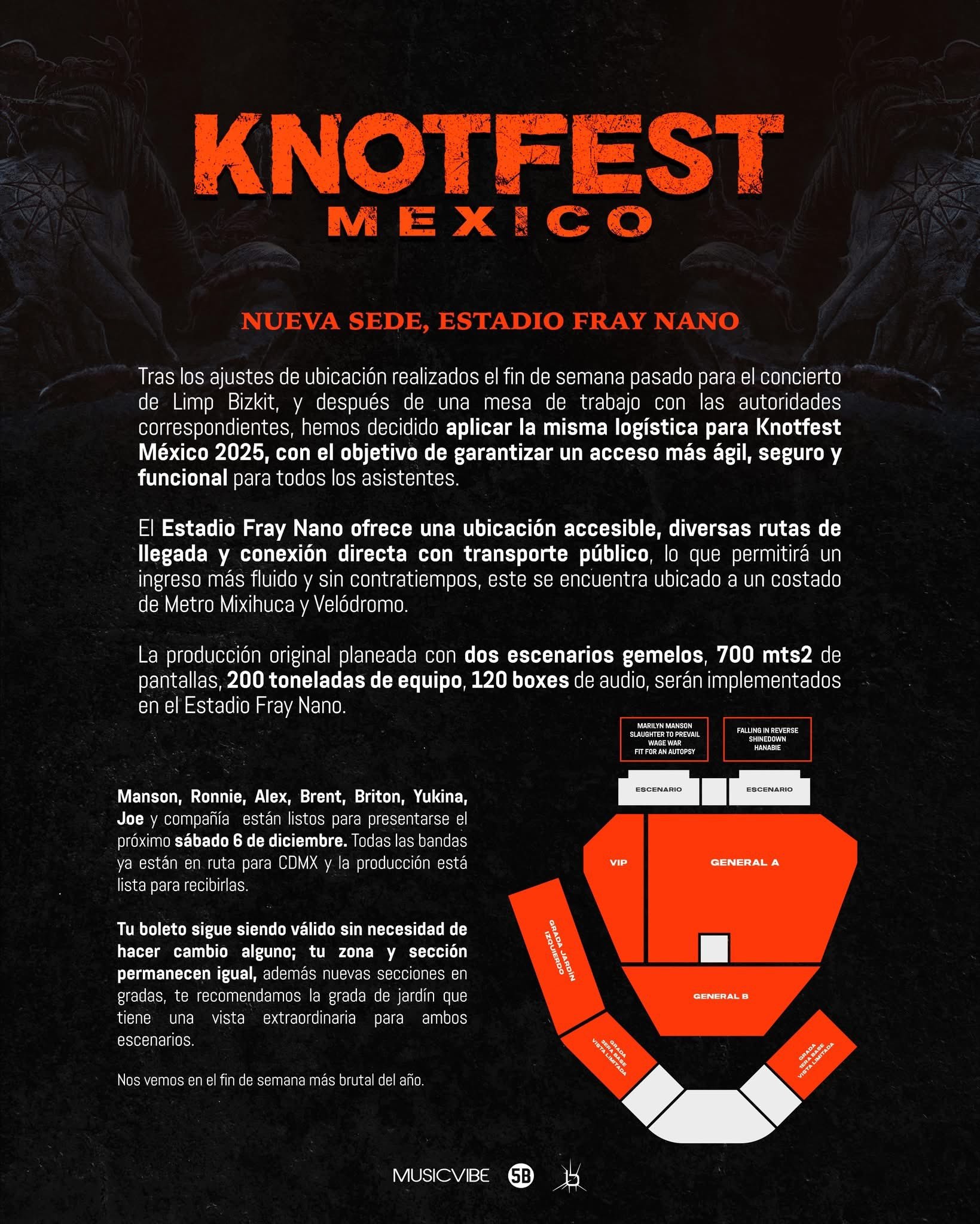 El acceso al Fray Nano abrirá a partir de las 14:30 horas, así que llega temprano para evitar filas y asegurar buena ubicación. La jornada contará con dos escenarios de alto voltaje: