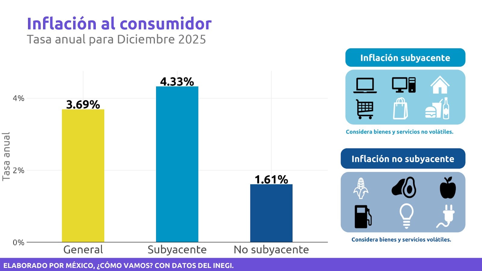 Ciudad de México, México.- La inflación en México cerró en 3.69 por ciento anual en diciembre de 2025.