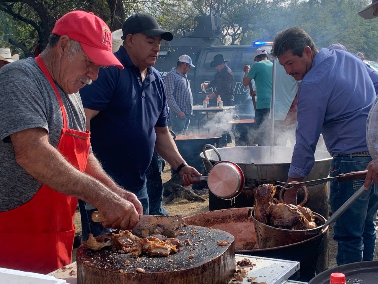 El atrio del templo se convirtió en un enorme salón de eventos para recibir a unos mil 500 comensales. La comunidad entera y vecinos de otros ‘ranchos’ se reúnen aquí para la celebración. El menú incluye arroz con mole y pollo, frijoles charros, todo cocinado por las mujeres de la comunidad; también hay carnitas que los hombres están preparando en cinco o seis cazos de cobre colocados en la calle principal, casi frente al templo y justo donde, a marchas forzadas, una cuadrilla de trabajadores arman un enorme escenario para el baile de la noche.