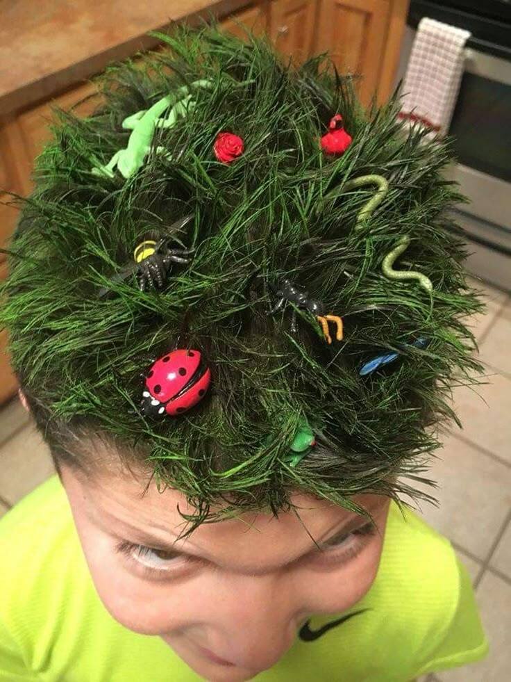 Peinado loco jardín. Fuente: Pinterest. Este peinado consiste en despeinarse un poco el cabello y pintarlo con pintura para el cabello no permanente de color verde. Pega figuras de insectos en broches y colócalos de la manera que más te guste en el cabello.