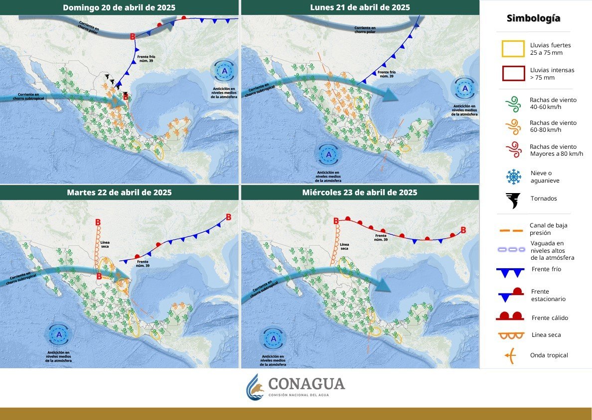 La semana del 20 al 26 de abril comenzará con la presencia del frente frío 39 en el noreste del territorio nacional y la entrada de humedad en el Golfo de México que originarán chubascos, lluvias, caída de granizo en algunas entidades.