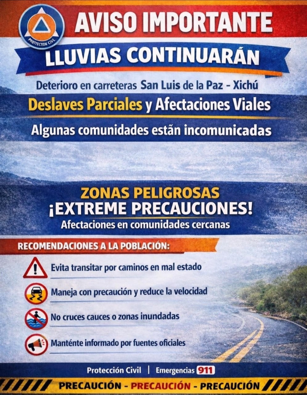 Por lo que se deberán seguir diversas recomendaciones: evitar transitar por caminos en mal estado, manejar con precaución y reducir la velocidad, no cruzar cauces o zonas inundadas, no intentar cruzar ríos o arroyos ni introducirse a cuerpos de agua, así como mantenerse informado a través de fuentes oficiales.