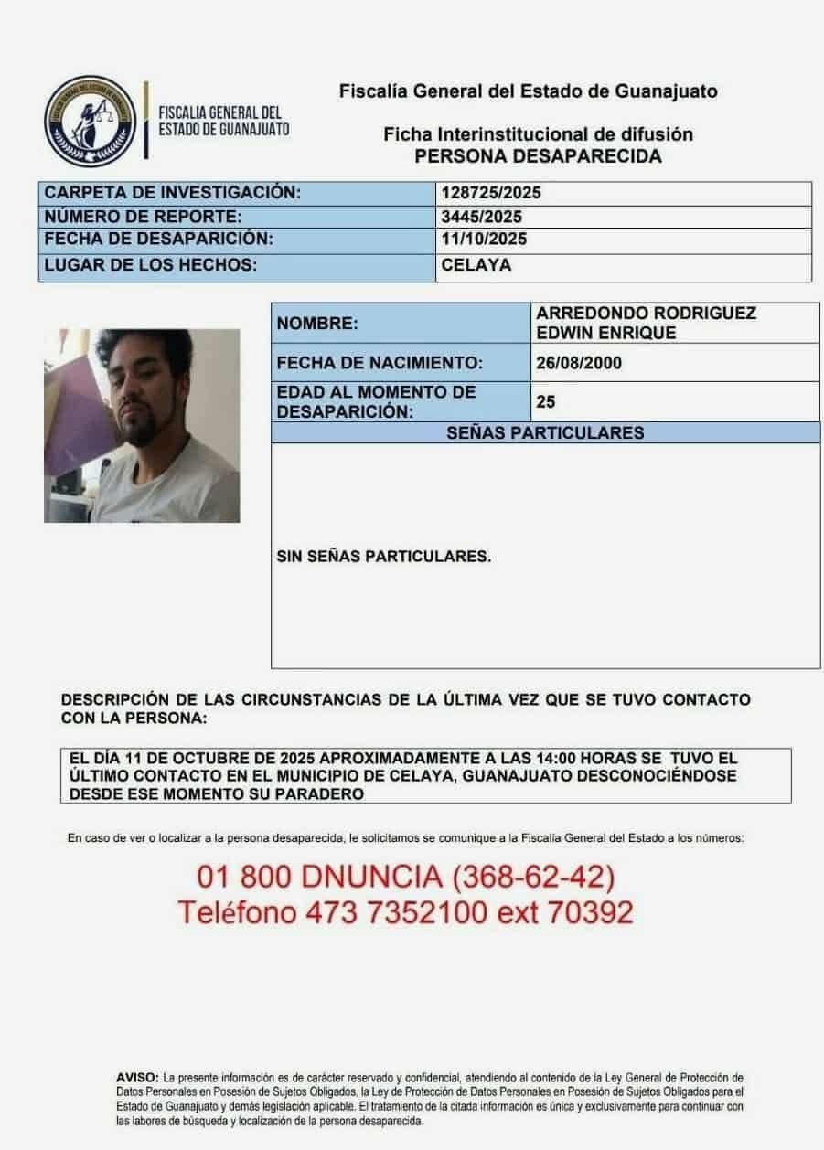 La Fiscalía General del Estado de Guanajuato (FGE) emitió una ficha interinstitucional de búsqueda para localizar a Edwin Enrique Arredondo Ramírez, de 25 años, visto por última vez el pasado 11 de octubre alrededor de las 14:00 horas. Desde entonces, no se ha tenido contacto con él ni existen indicios sobre su paradero.