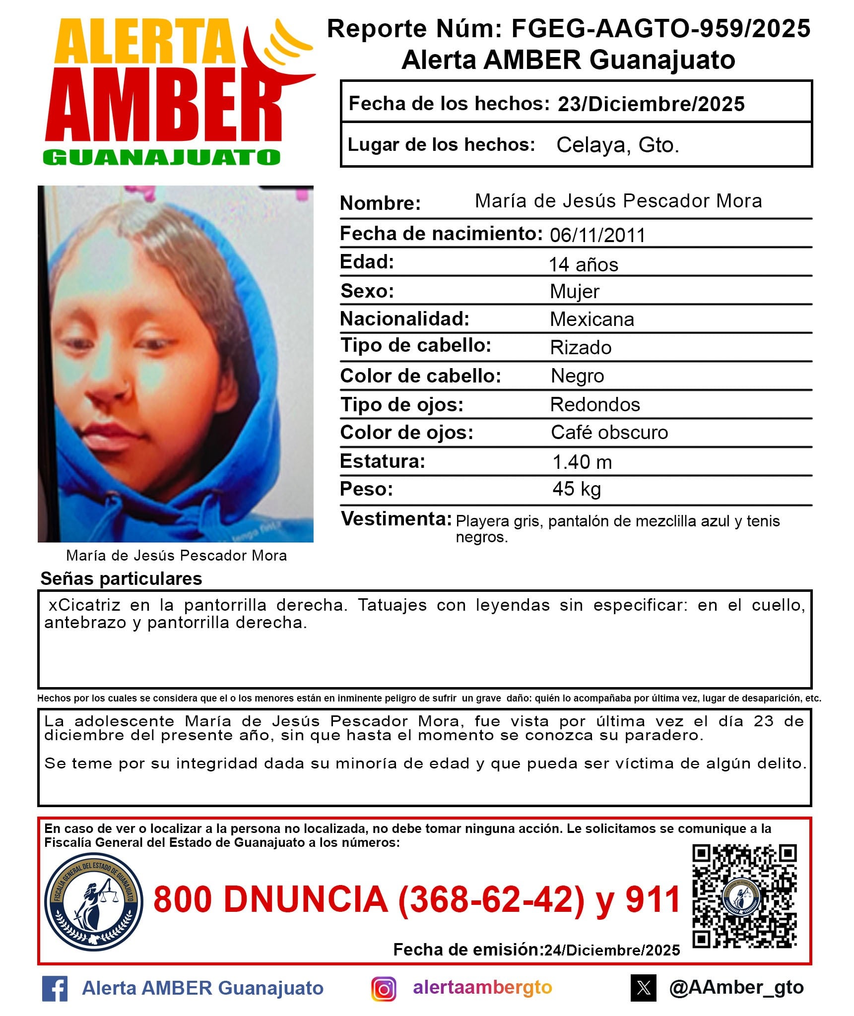 Celaya, Gto.- La adolescente María de Jesús Pescador Mora desapareció en Celaya el pasado 23 de diciembre previo a Nochebuena.