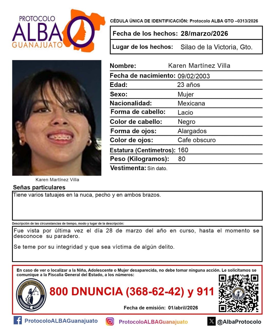 Entre los casos se encuentra el de Karen Martínez Vila, de 23 años de edad, vista por última vez en Silao de la Victoria.