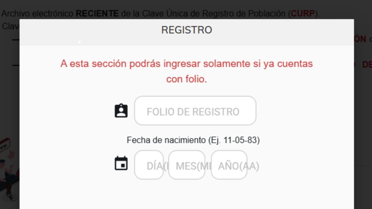 Una vez generado el folio, deberás acceder a la sección de la página donde dice ‘Registro’ y escribir el folio y tu fecha de nacimiento para seguir con el registro.
