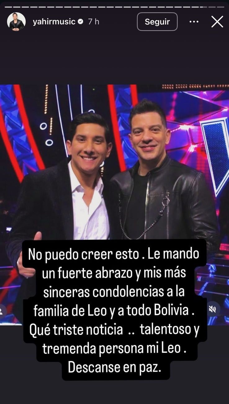 El sonorense, quien fue coach de Rosas en el reality show musical, expresó su consternación esta tarde, a través de una historia de Instagram: “No puedo creer esto. Le mando un fuerte abrazo y mis más sinceras condolencias a la familia de Leo y a todo Bolivia. Qué triste noticia. Talentoso y tremenda persona, mi Leo. Descanse en paz”.