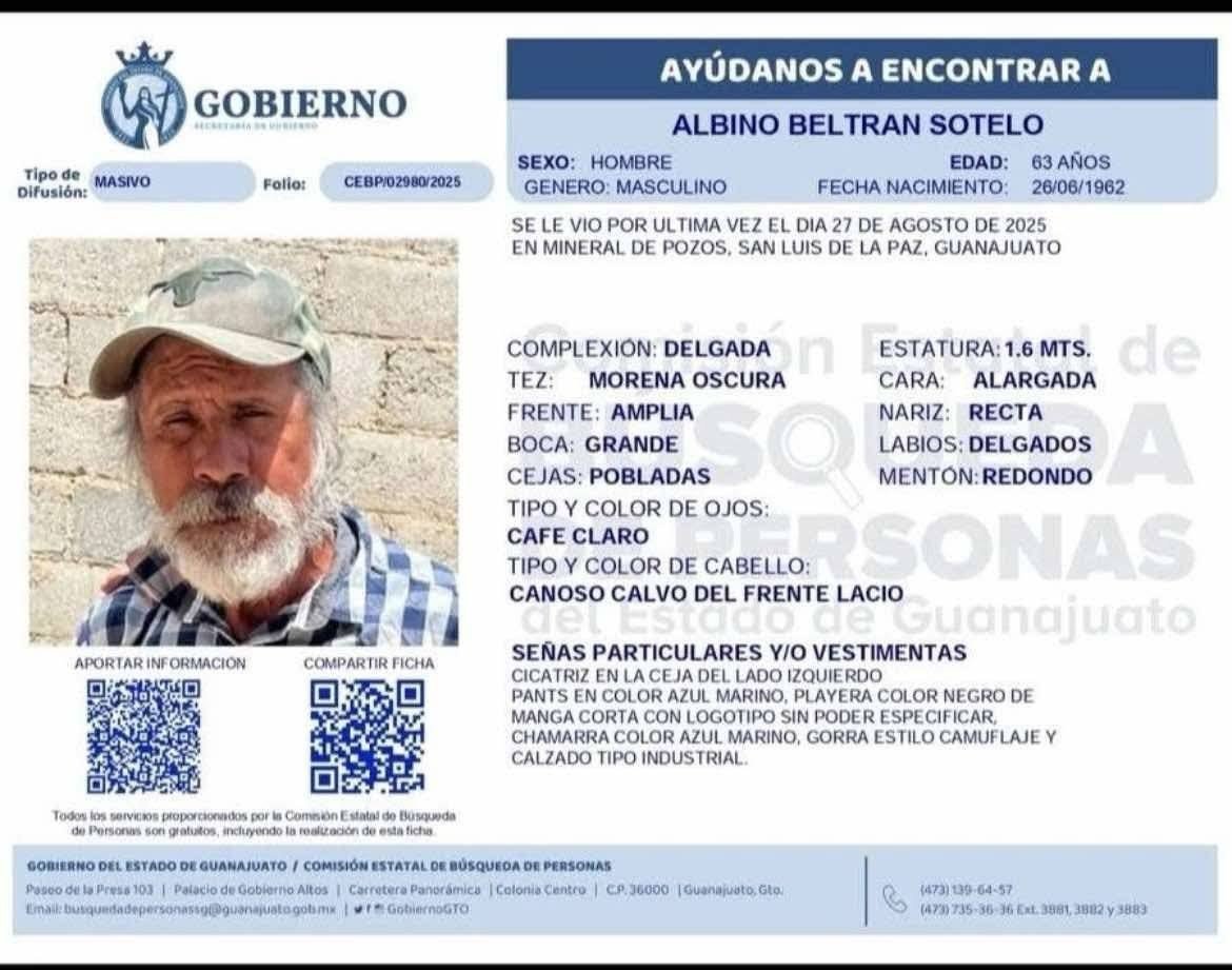 Primeramente, familiares del señor Albino Sotelo Beltrán de 63 años de edad confirmaron su hallazgo en un predio baldío localizado en Mineral de Pozos, en las inmediaciones de la carretera estatal 46.