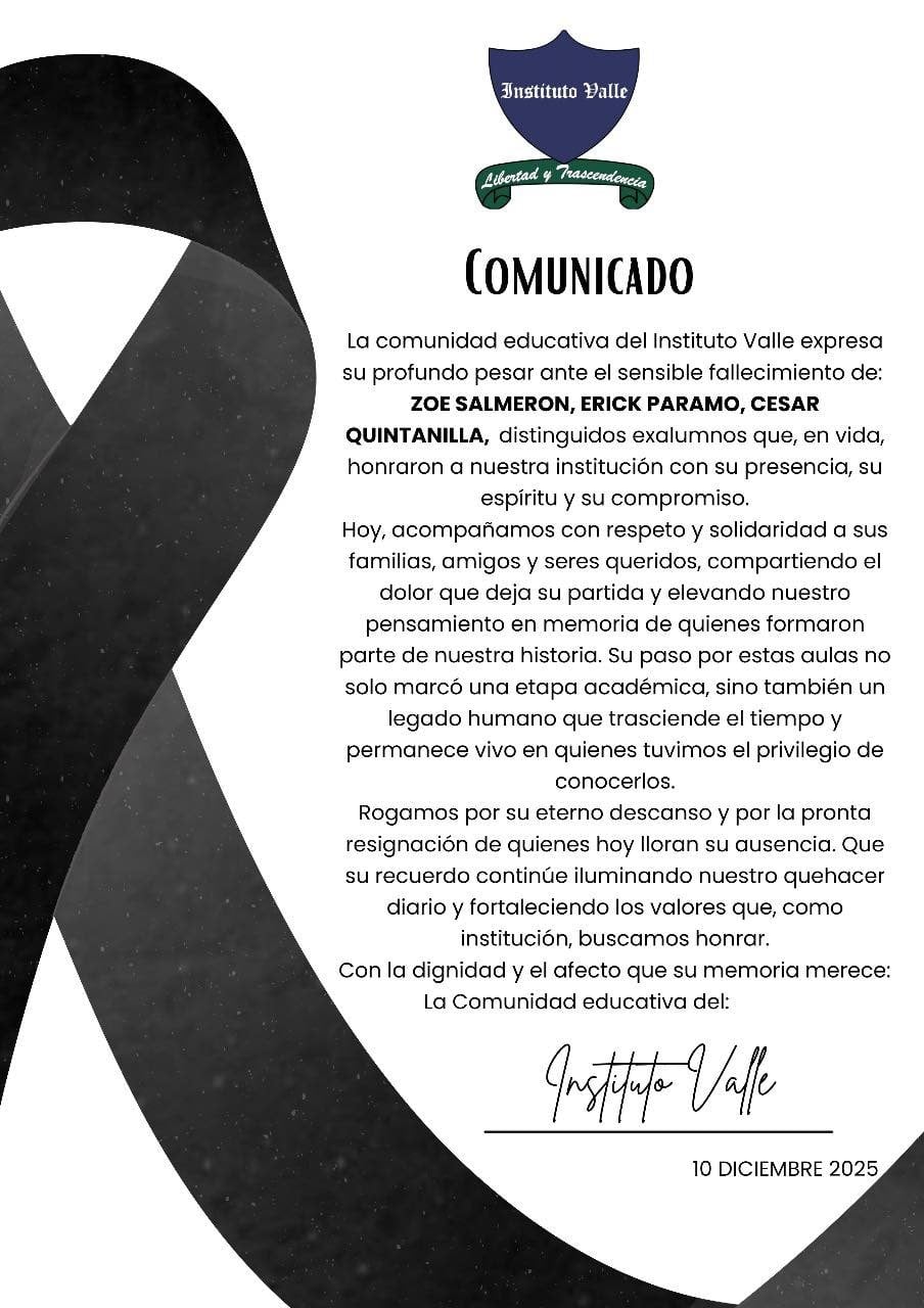 “La comunidad educativa del Instituto Valle, expresa su profundo pesar ante el sensible fallecimiento de: Zoe Salmerón, Erick Páramo y César Quintanilla, distinguidos exalumnos que, en vida, honraron a nuestra institución con su presencia, su espíritu y su compromiso.