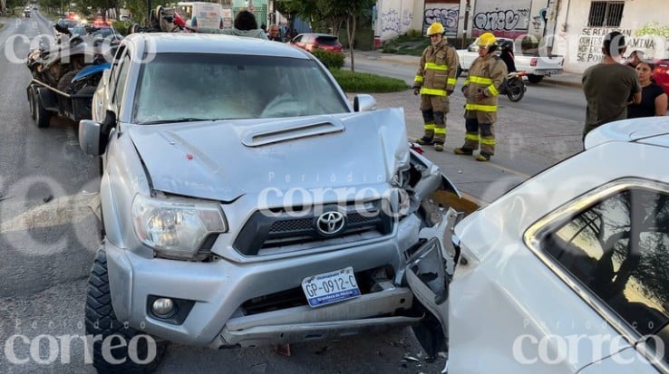León, Gto.- Un accidente vial entre una motocicleta y un peatón dejó como saldo tres personas lesionadas en la colonia Brisas del Campestre.