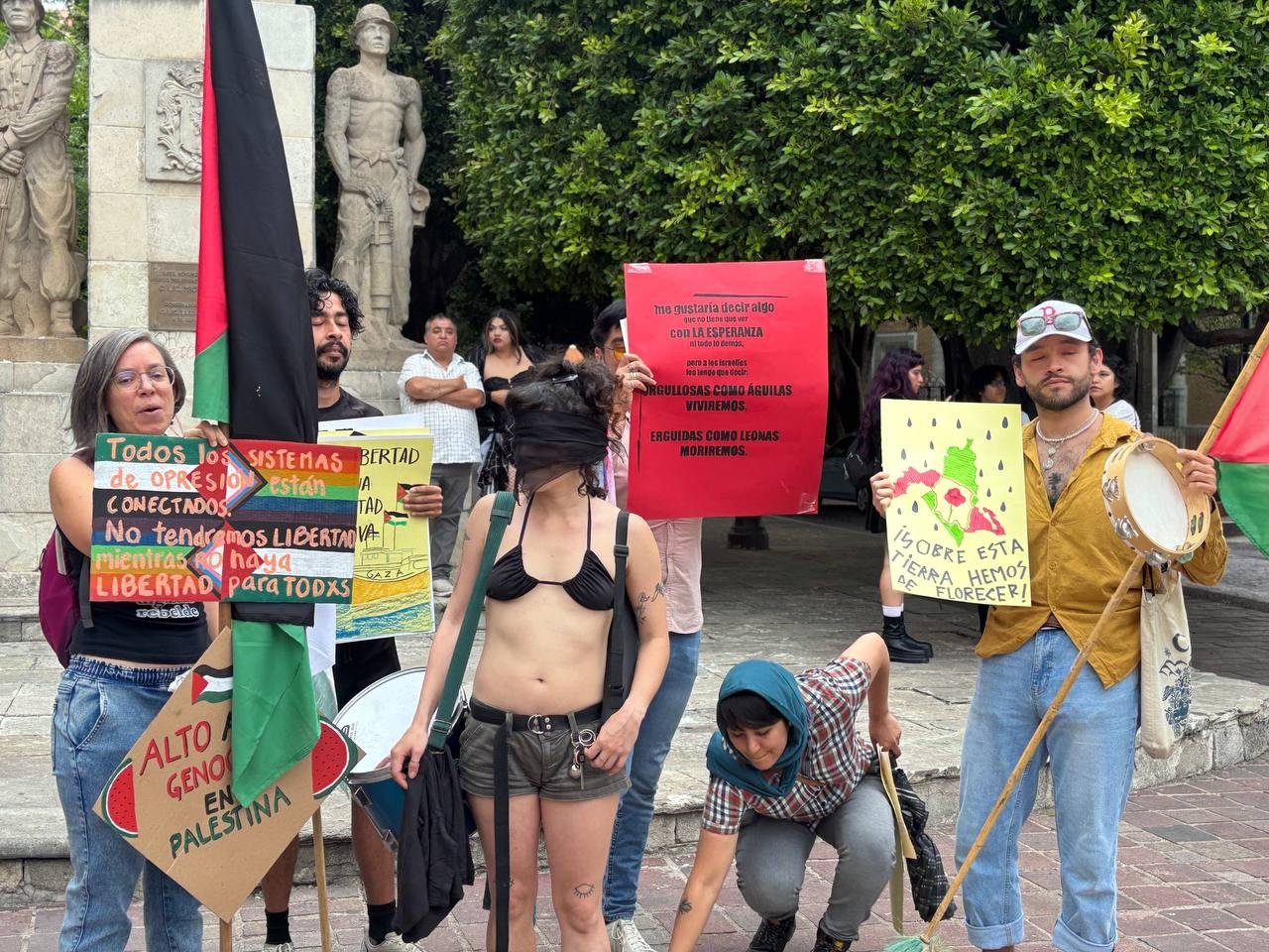 Guanajuato, Gto.- “No hay orgullo con genocidio”: el Grupo Pro Palestina alzó la voz durante la Marcha Pride en Guanajuato capital donde el contingente sufrió las consecuencias del clima.
