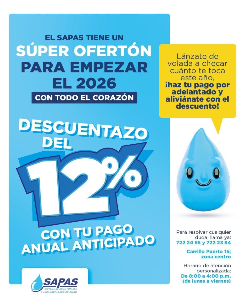 Silao, Gto.- Para empezar el 2026 con saldo positivo, el Sistema de Agua Potable y Alcantarillado de Silao (SAPAS) ofrece el descuento del 12 por ciento por el pago anual anticipado durante enero y febrero.