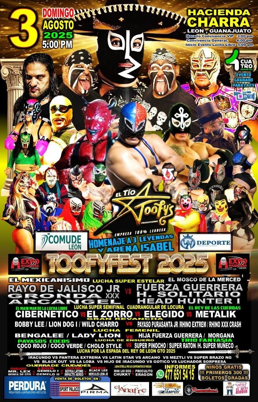 León, Gto.- Ya está todo listo para que los amantes de la lucha libre disfruten del Toofyfest 2025, un encuentro donde rudos y técnicos se darán con todo el próximo domingo 3 de agosto en la Hacienda Charra de León.