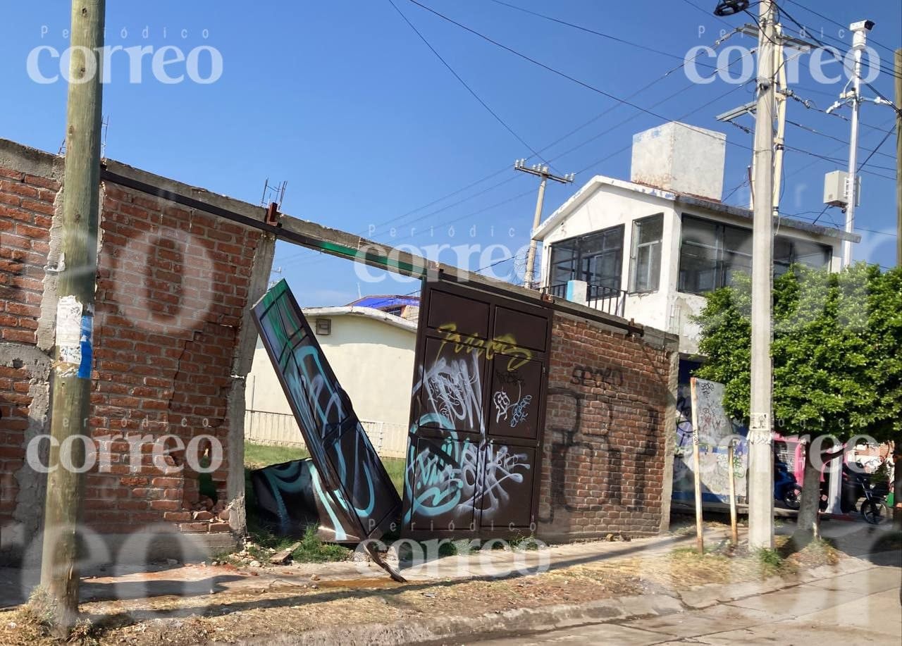 La camioneta pick up de doble cabina y con número económico 3786 derribó parte de un muro y del portón metálico de una finca que se encuentra al costado de una caseta de vigilancia, a unos metros del crucero del tren y de la colonia Los Ángeles.
