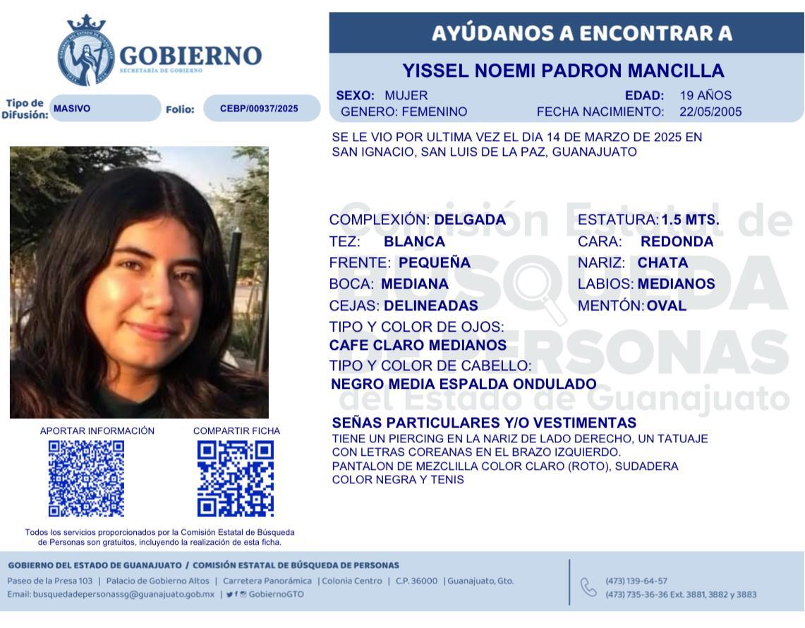 Yissel Noemí Padrón Mancilla, de 19 años, desapareció el 14 de marzo de 2025 en San Ignacio, San Luis de la Paz. Es de complexión delgada, tez blanca, y tiene cabello negro ondulado hasta la mitad de la espalda. Entre sus señas particulares, cuenta con un piercing en la nariz derecha y un tatuaje con letras coreanas en el brazo izquierdo. Al momento de su desaparición, vestía pantalón de mezclilla claro, sudadera negra y tenis.