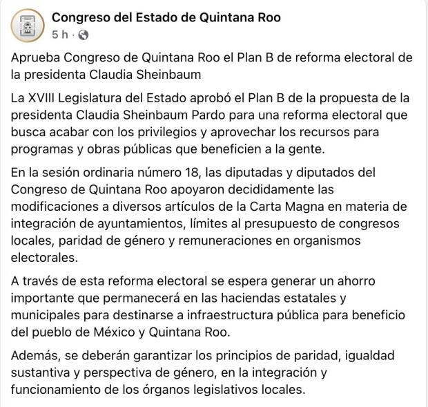 Con 20 votos a favor, de las fracciones parlamentarias de Morena, PVEM y PT; y cuatro en contra, del PAN, PRI y Movimiento Ciudadano, la XVIII Legislatura de Quintana Roo aprobó “El Plan B” en materia electoral.