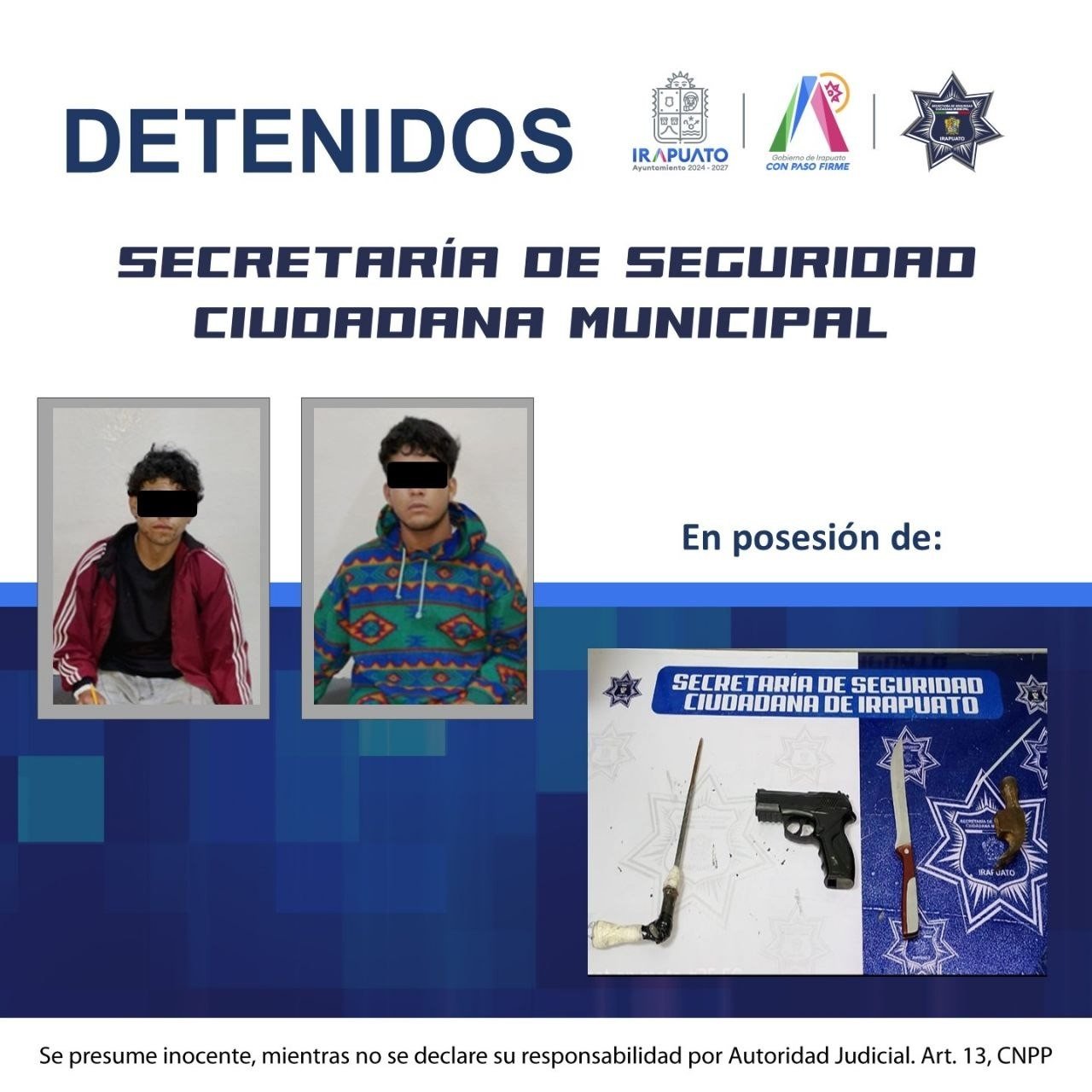 Por medio de las acciones de prevención coordinadas con los sistemas de seguridad del estado, cámaras de video vigilancia municipales del C4, el gobierno municipal a través de la Secretaria de Seguridad Ciudadana, mantiene las detenciones y aseguramientos de fuentes de riesgo, que puedan afectar a las y los irapuatenses.