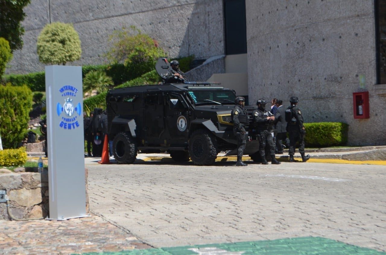 Previamente habían desfilado por ese punto alcaldes, secretarios de Estado, diputados y titulares de organismos como el INE y la UG, entre otros funcionarios que asistieron al acto. En el interior, personal de la FGE ocupó gran parte de las butacas; también había decenas de elementos de seguridad, algunos distribuidos en el lobby y pasillos, y otros asignados a cada una de las puertas de acceso a la sala.