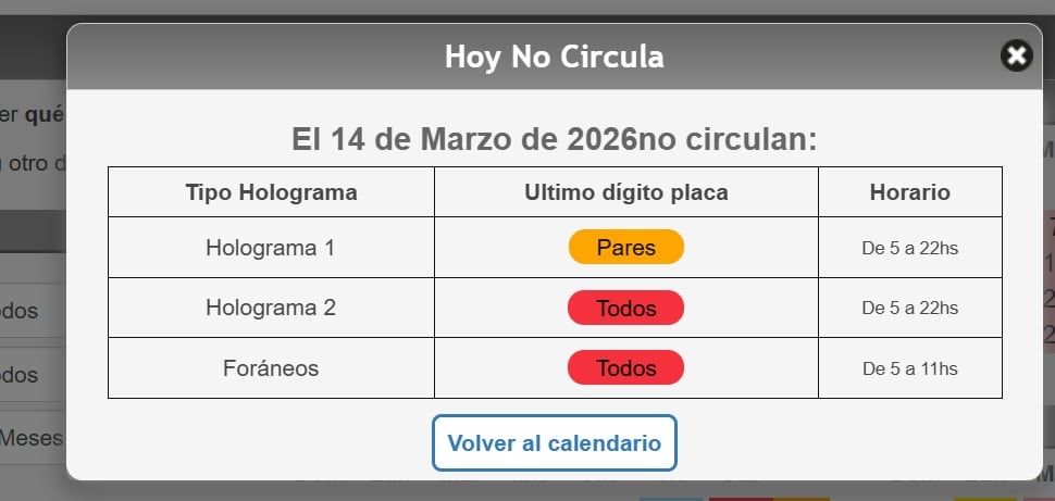 Este sábado 14 de marzo no circulan los vehículos con holograma 1 y terminación de placa par, es decir, 2, 4, 6, 8, y 0.
