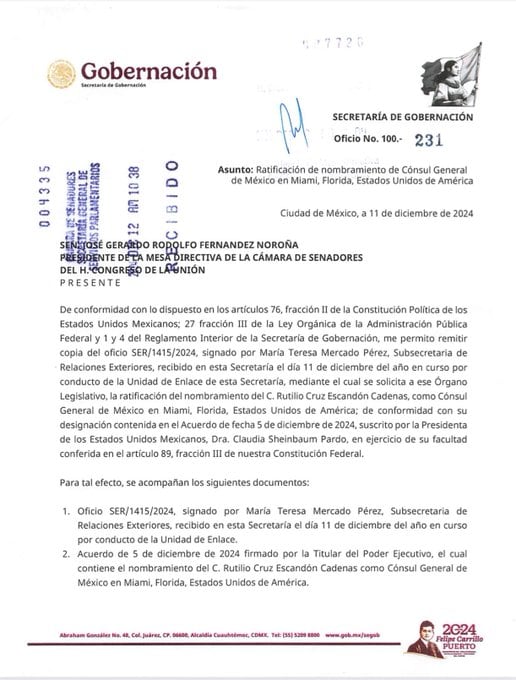 Este jueves, la mandataria remitió al Senado de la República la designación del nombramiento del exgobernador para su ratificación, el cual fue turnado a comisiones de la Cámara Alta para su dictaminación. Se prevé que se analice este viernes 13 de diciembre.