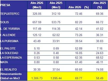 Entre los principales cuerpos de agua que se monitorean en cuanto al nivel de almacenamiento destacan: Presa de Tepuxtepec, Presa Solís, Laguna de Yuriria, Presa Ignacio Allende, la Presa La Purísima, el Palote, La Soledad, La Esperanza, Mata, y el Realito.