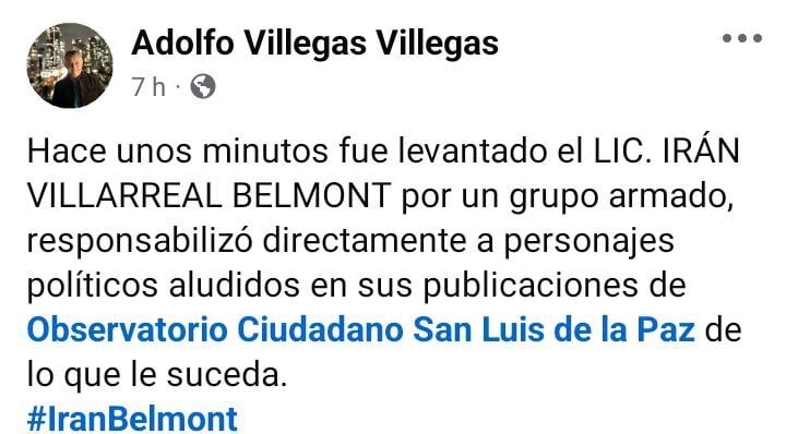 El hecho fue denunciado primeramente por el ex regidor Adolfo Villegas, quien en una declaración pública posteada en su red social informó; “Hace unos minutos fue levantado el LIC. IRÁN VILLARREAL BELMONT por un grupo armado, responsabilizo directamente a personajes políticos aludidos en sus publicaciones de Observatorio Ciudadano San Luis de la Paz de lo que le suceda”, indicó en su red social.