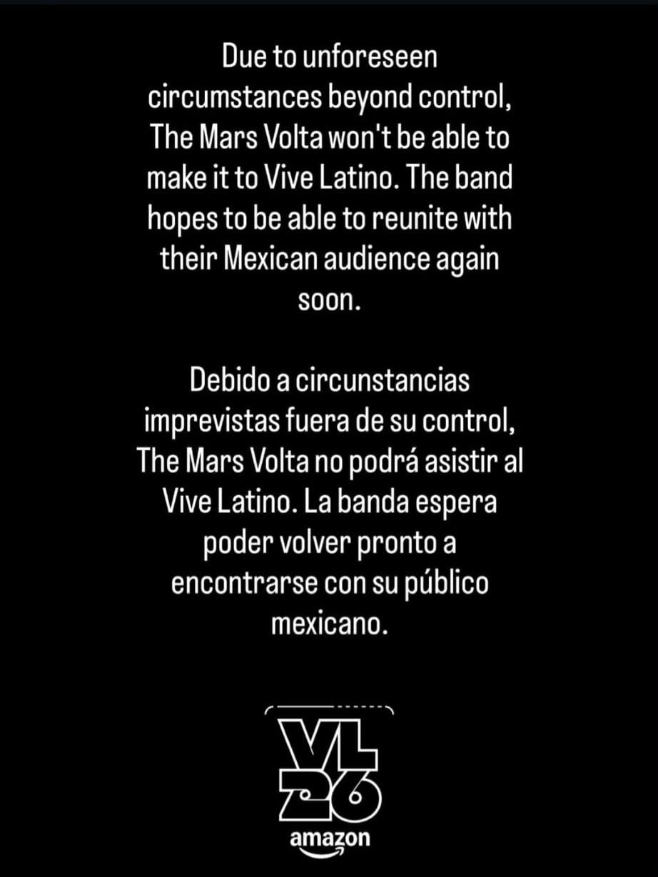 Ciudad de México, México.- La banda The Mars Volta anunció la cancelación de su presentación en Vive Latino 2026.