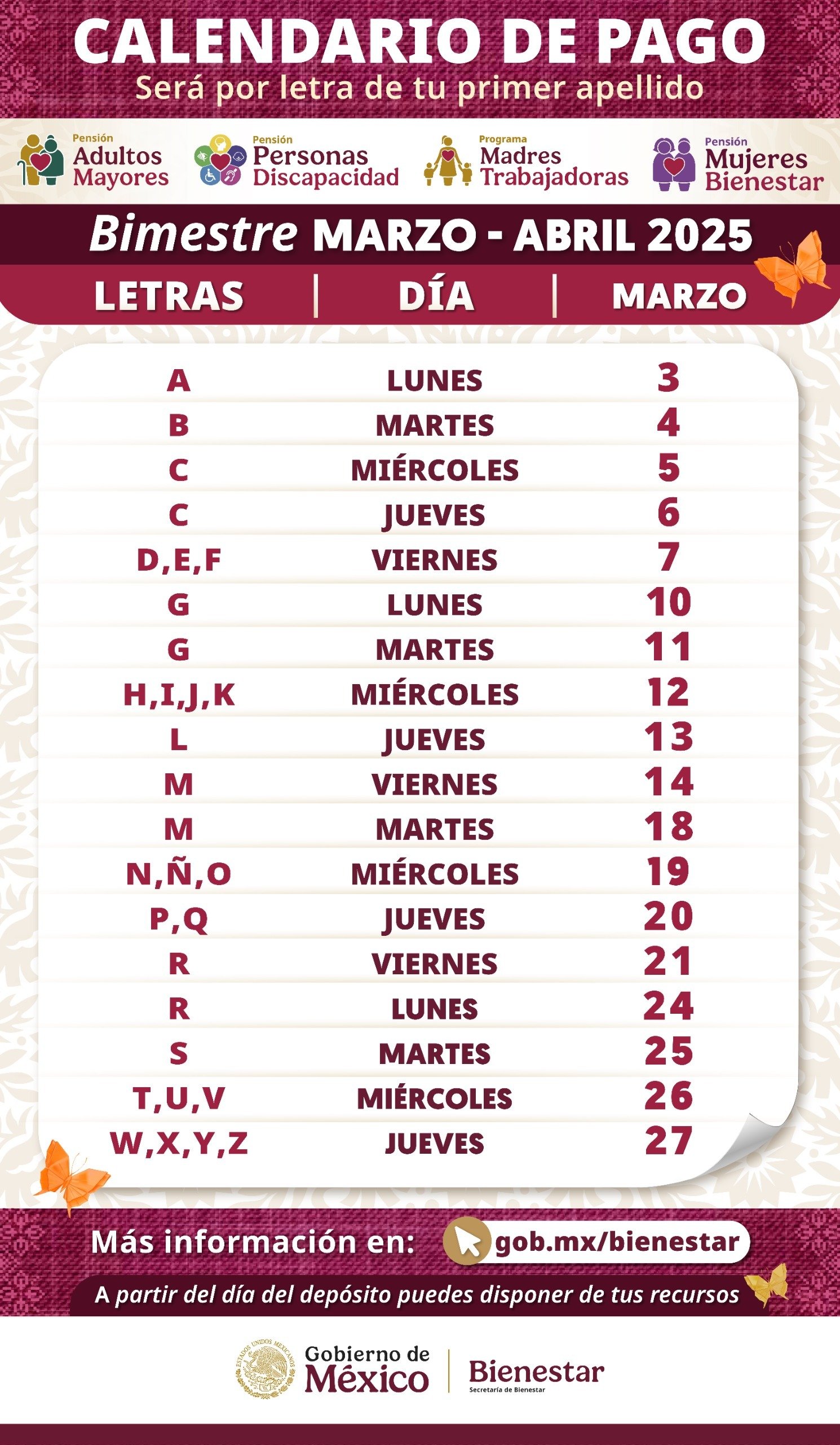 Cabe mencionar que los pagos de los programas sociales se hacen con base al calendario emitido por la dependencia, será hasta el 27 de marzo cuando se terminen de entregar los recursos tomando en cuenta la inicial del apellido paterno.