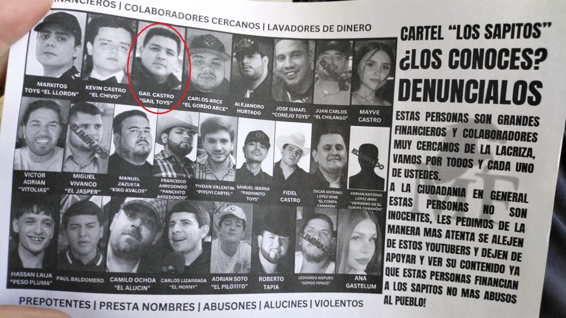 Culiacán, Sinaloa.- Desde el pasado mes de enero en diversas zonas de Culiacán, comenzó a circular una imagen con nombres de los hermanos Castro Cárdenas: Gail, Kevin, Mayve y Markitos Toys, señalados como presuntos colaboradores financieros del grupo delictivo Los Sapitos.