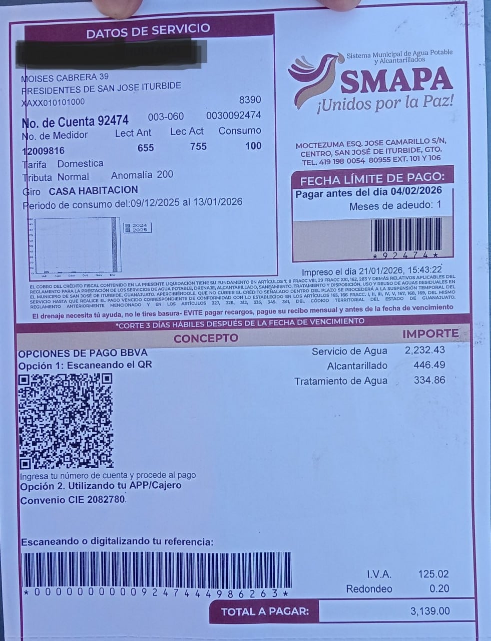 San José Iturbide, Gto.- Usuarios del Sistema Municipal de Agua Potable y Alcantarillado (SMAPA) de San José de Iturbide, denunciaron cobros excesivos por el servicio de agua potable, observando ‘irregularidades’ en los recibos domiciliarios.