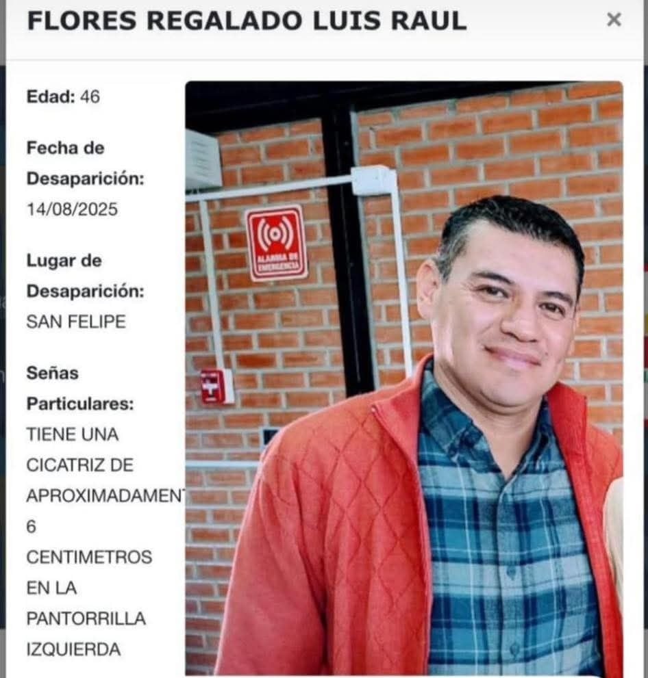 San Felipe, Guanajuato.Luis Raúl Flores Regalado, profesor y abogado de 46 años originario de León, fue reportado como desaparecido en el municipio de San Felipe.
